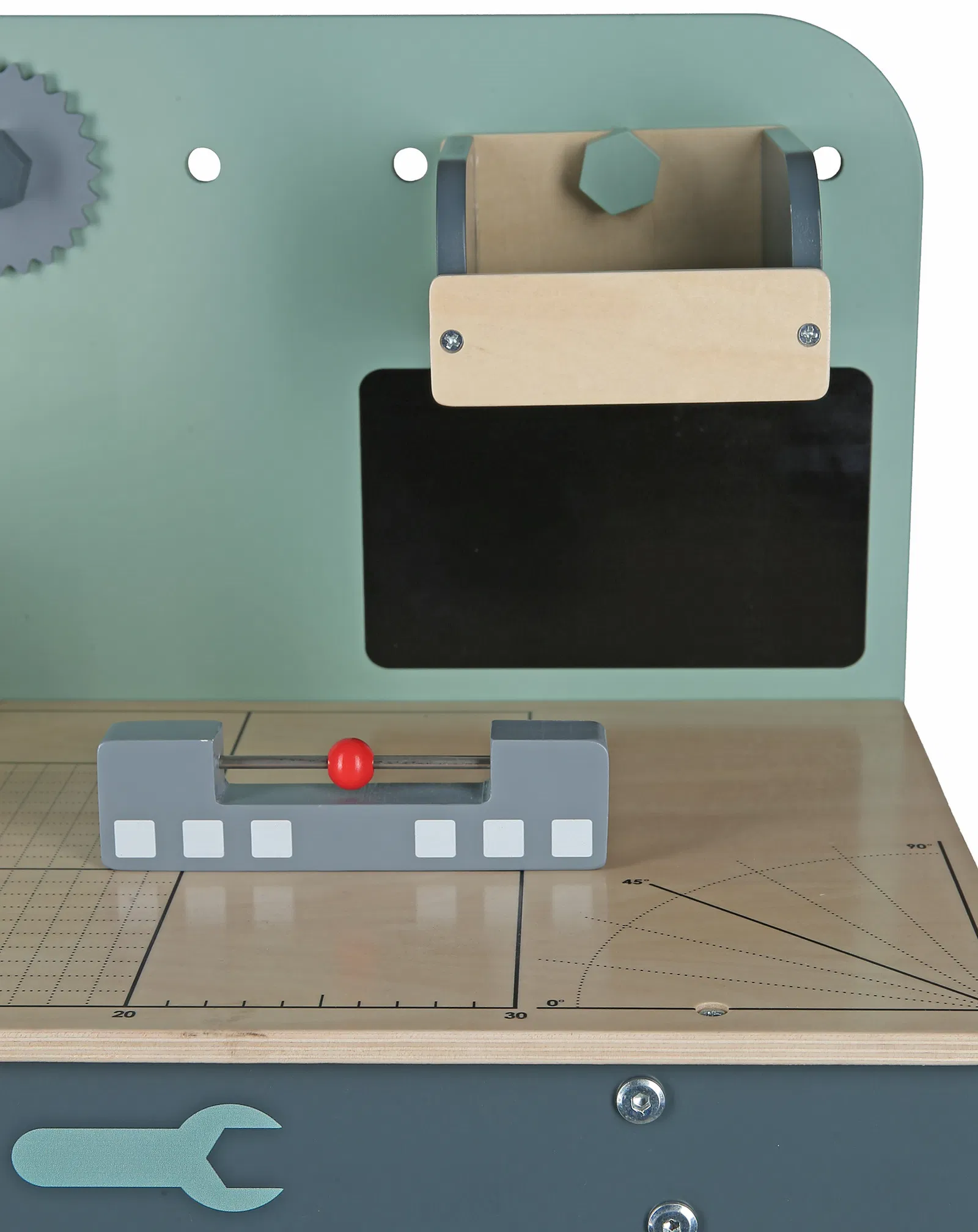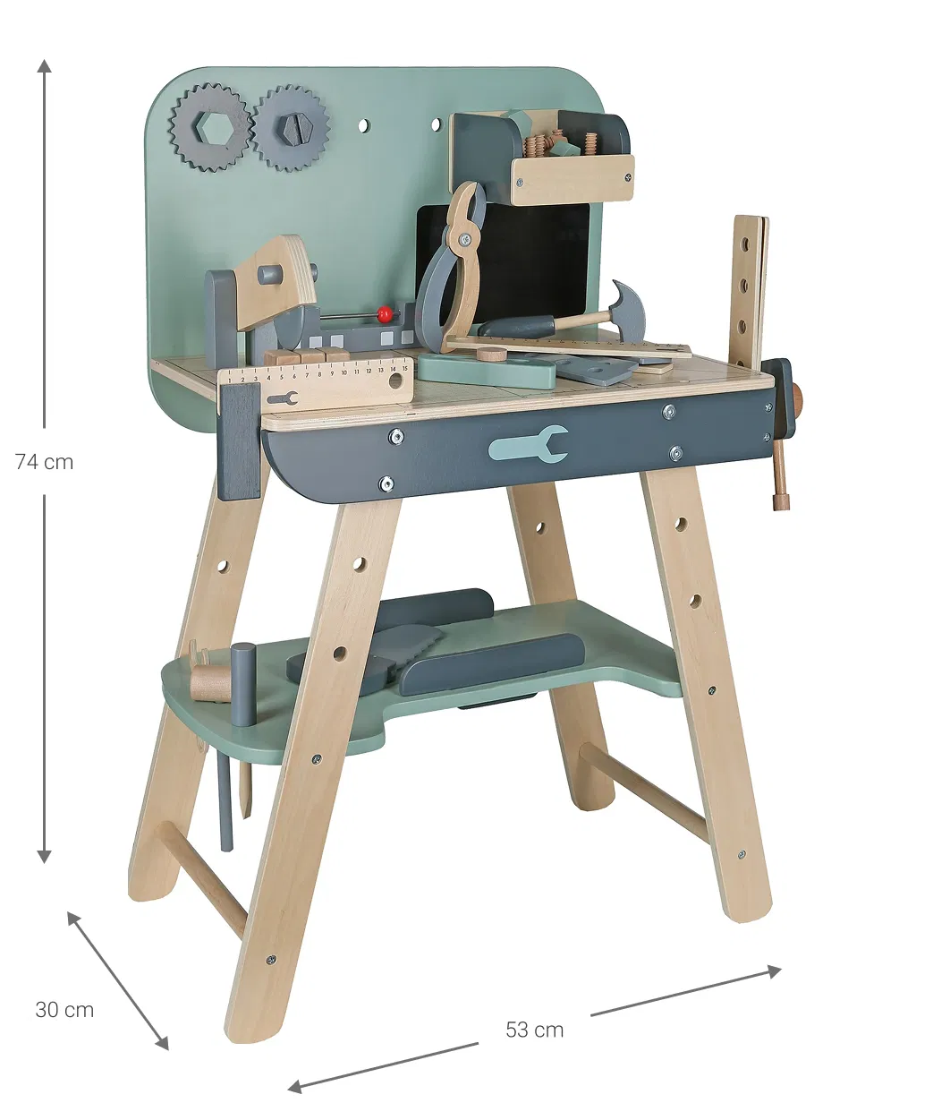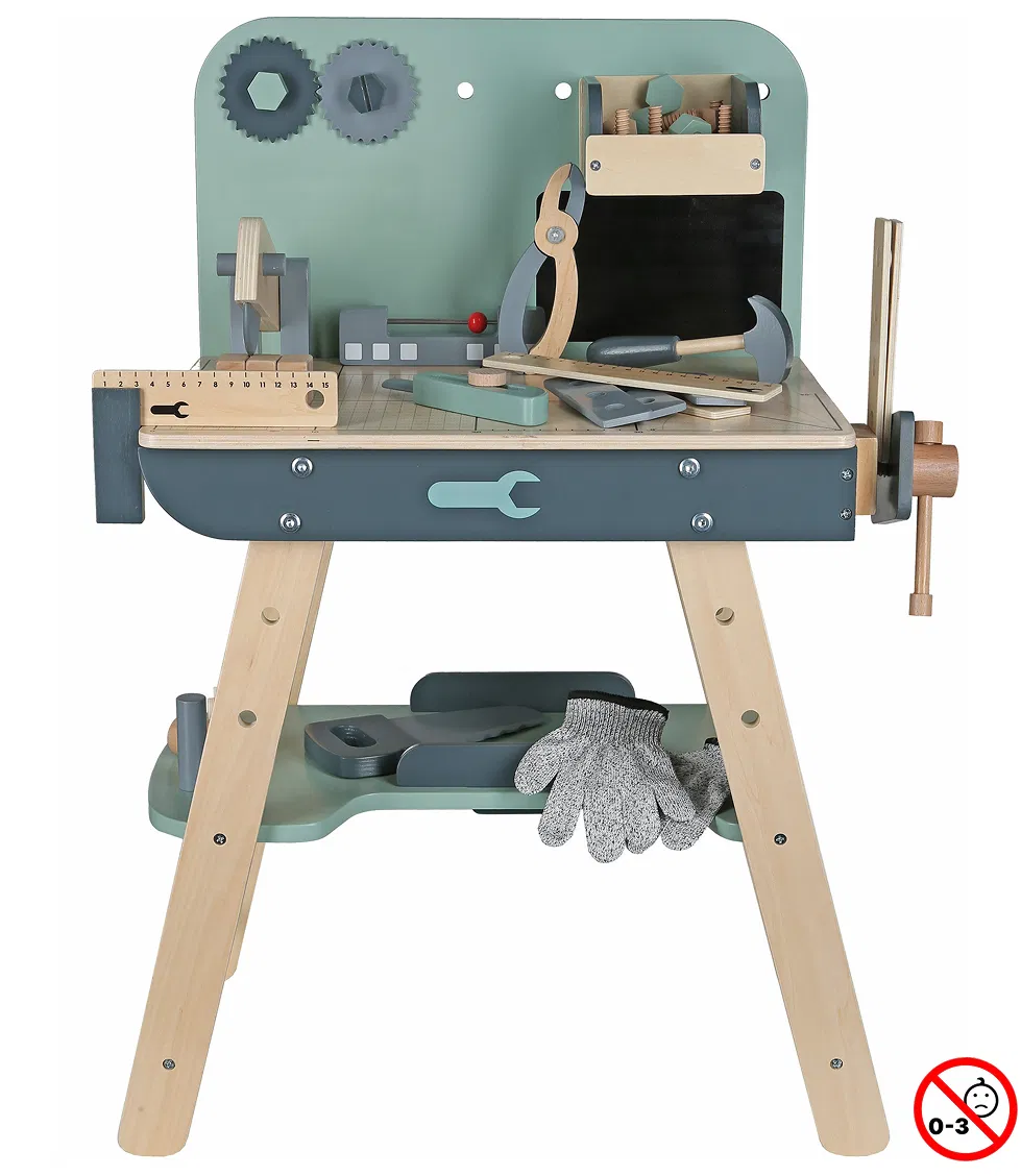 Το σετ περιλαμβάνει εργαλεία όπως κατσαβίδι, γρανάζια, σφυρί και γωνιόμετρο, προσφέροντας πολλές δυνατότητες για κατασκευές και δημιουργικές ιδέες. Ο λειτουργικός σχεδιασμός και οι πρακτικοί αποθηκευτικοί χώροι βοηθούν τα παιδιά να οργανώνουν τα εργαλεία τους, καλλιεργώντας την υπευθυνότητα και την αυτονομία.