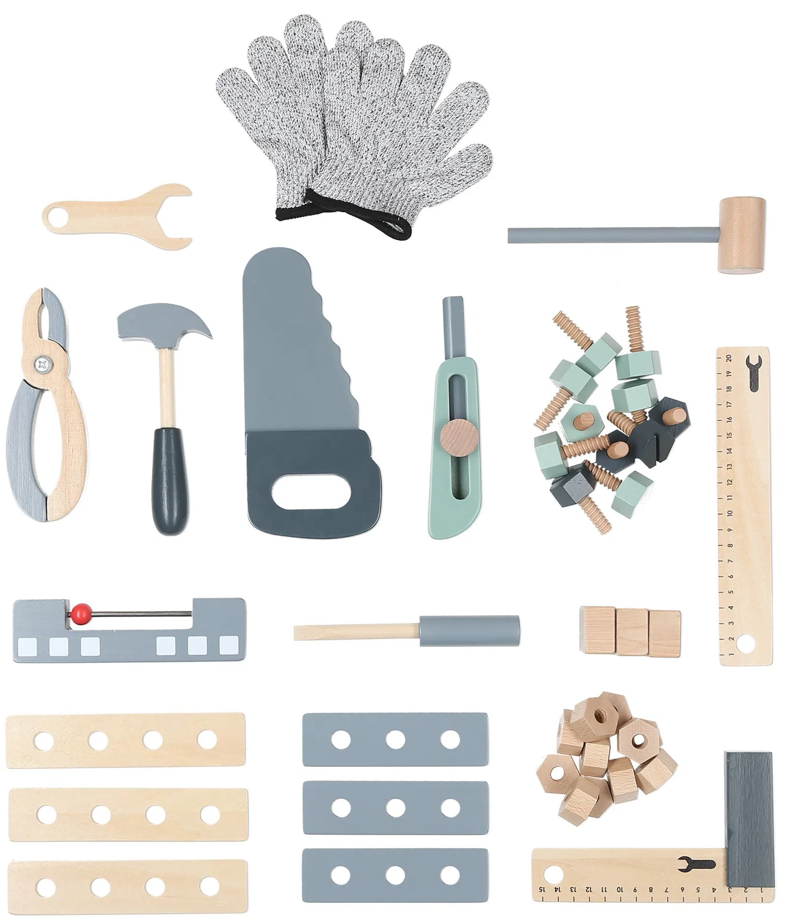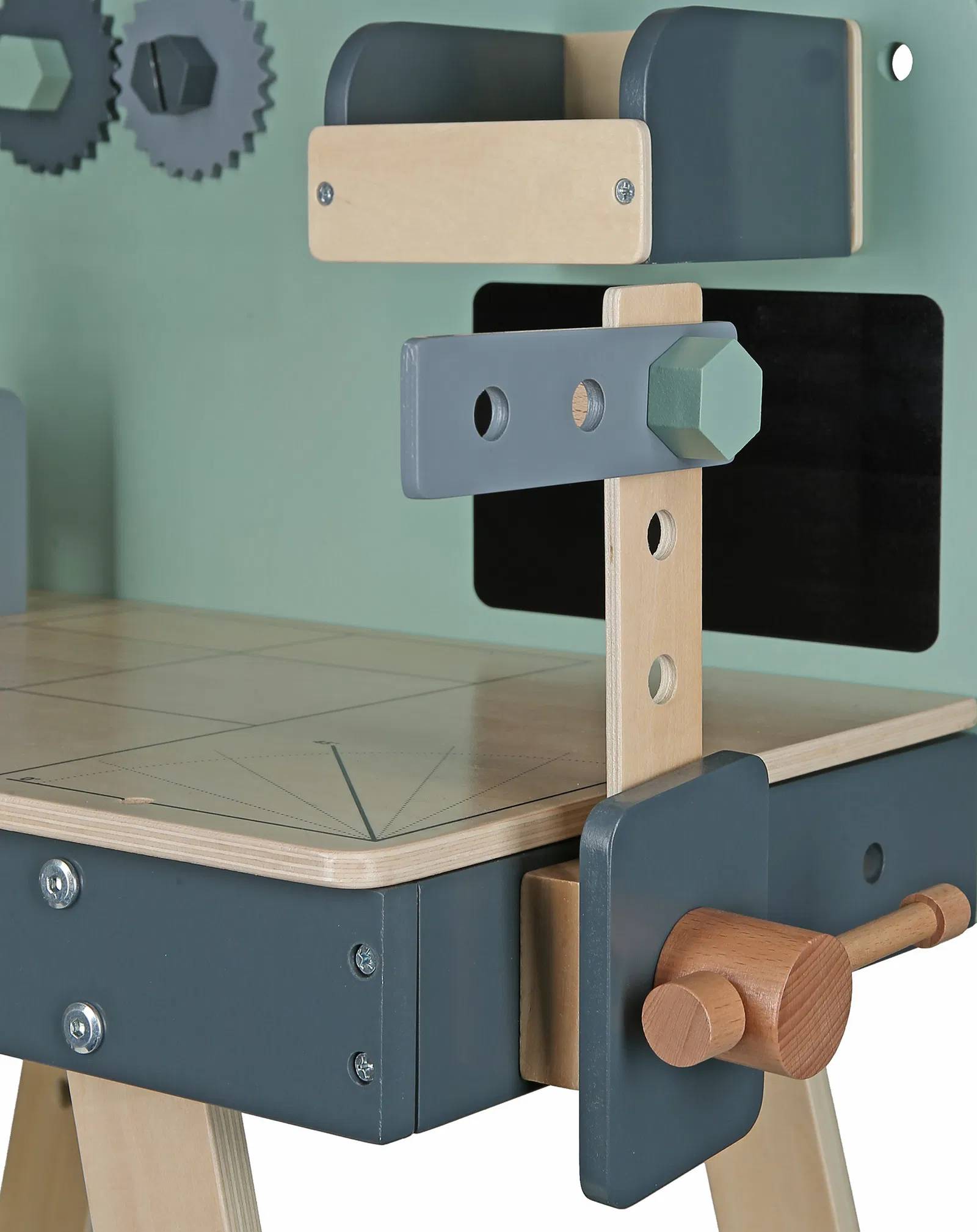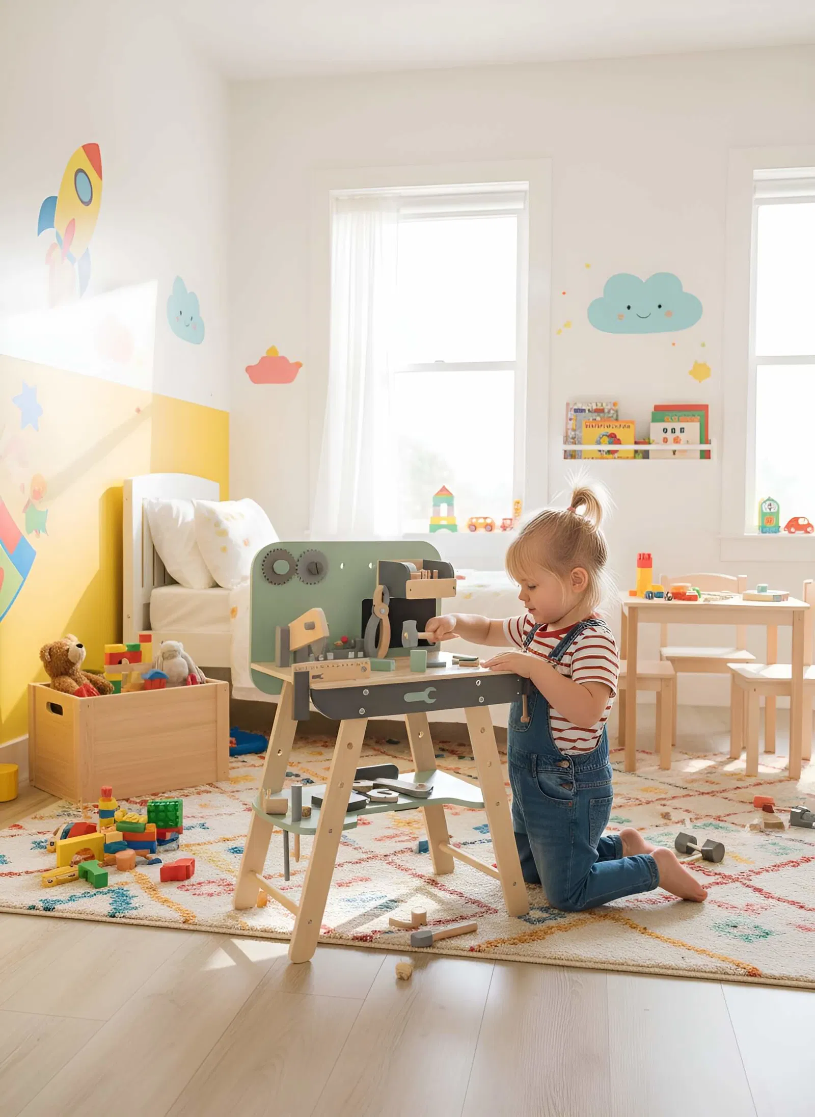 Το σετ περιλαμβάνει εργαλεία όπως κατσαβίδι, γρανάζια, σφυρί και γωνιόμετρο, προσφέροντας πολλές δυνατότητες για κατασκευές και δημιουργικές ιδέες. Ο λειτουργικός σχεδιασμός και οι πρακτικοί αποθηκευτικοί χώροι βοηθούν τα παιδιά να οργανώνουν τα εργαλεία τους, καλλιεργώντας την υπευθυνότητα και την αυτονομία.
