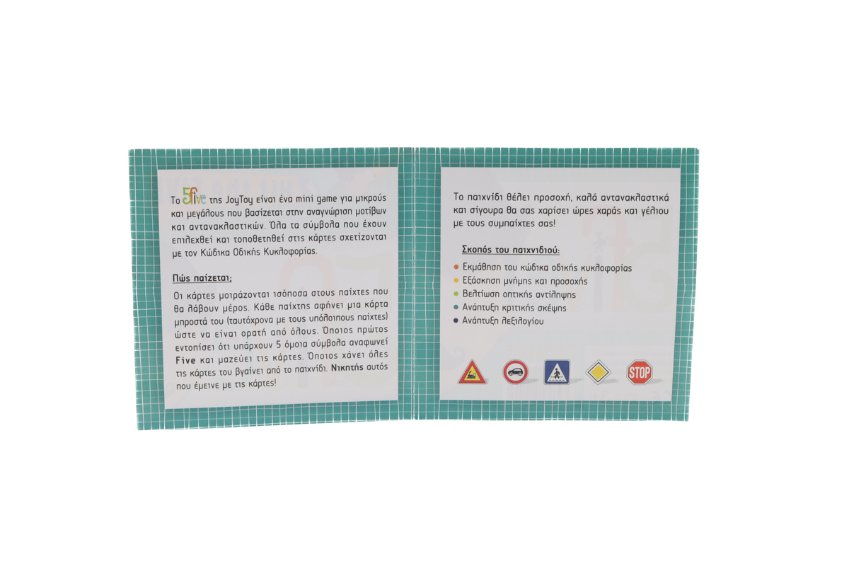 Το Five είναι ένα επιτραπέζιο mini game που βασίζεται στην ταχύτητα αντίληψης και την αναγνώριση μοτίβων, με θεματολογία από τον Κώδικα Οδικής Κυκλοφορίας. Οι παίκτες ανοίγουν ταυτόχρονα από μία κάρτα μπροστά τους και προσπαθούν να εντοπίσουν πρώτοι πότε εμφανίζονται 5 όμοια σύμβολα. Όποιος το δει πρώτος, αναφωνεί “Five” και παίρνει τις κάρτες.