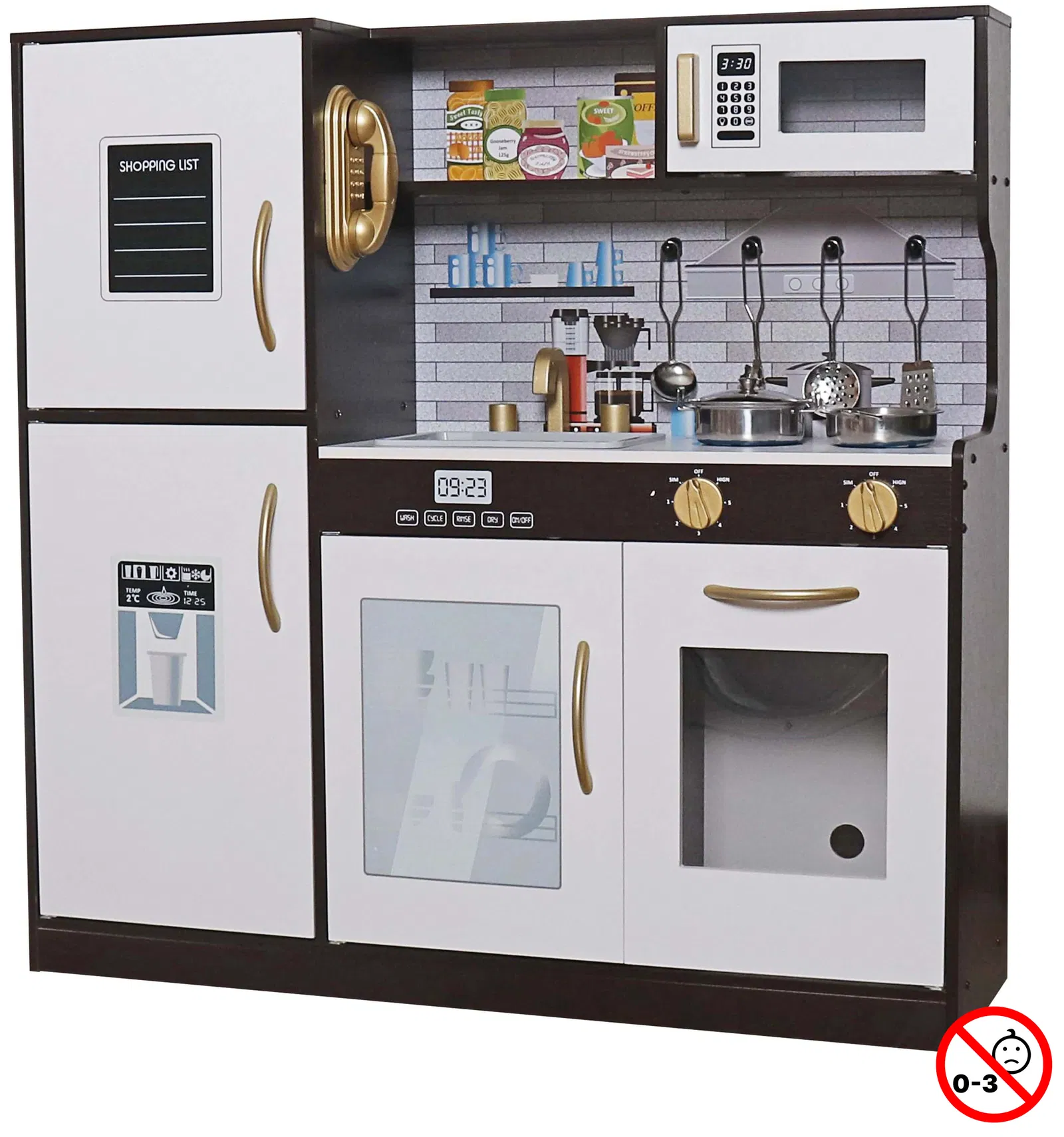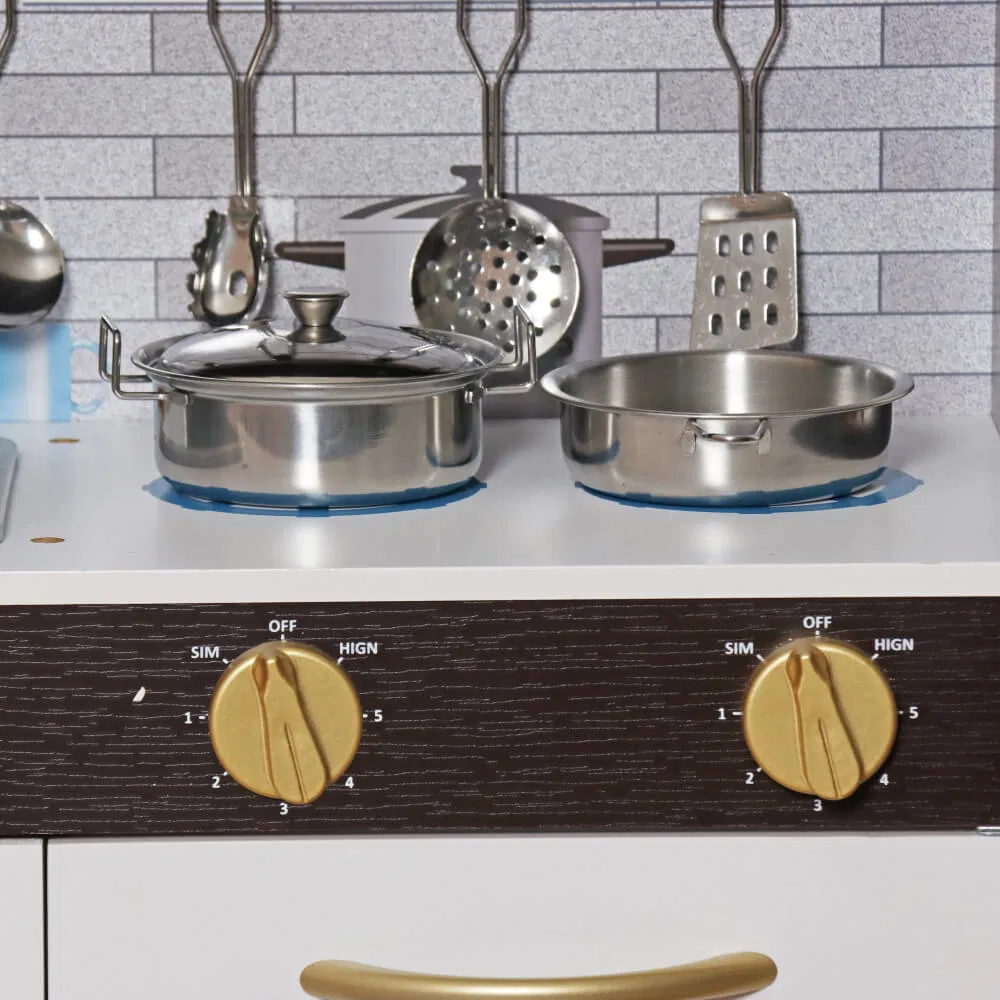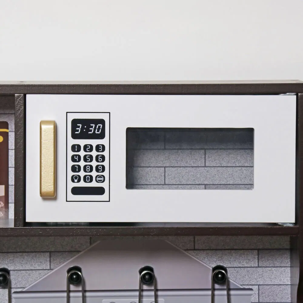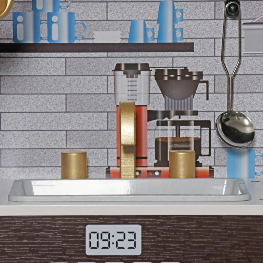Η κουζίνα διαθέτει ψυγείο για την αποθήκευση «φρέσκων» υλικών, φούρνο και εστίες για το μαγείρεμα, φούρνο μικροκυμάτων για το ζέσταμα και πλυντήριο πιάτων για την ολοκλήρωση της διαδικασίας. Τα παιδιά μπορούν να πλένουν τα σκεύη, να τα οργανώνουν και να δημιουργούν καθημερινές σκηνές, ενισχύοντας τη δημιουργική σκέψη και την υπευθυνότητα. Τα φωτεινά εφέ LED προσθέτουν ρεαλισμό και κάνουν το παιχνίδι ακόμη πιο διασκεδαστικό.